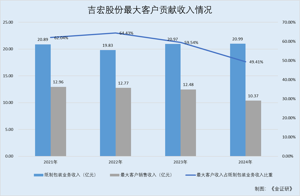 即经测算,2021-2024年,最大客户贡献的收入占吉宏股份纸制包装业务收入的62.04%、64.43%、59.54%、49.41%。