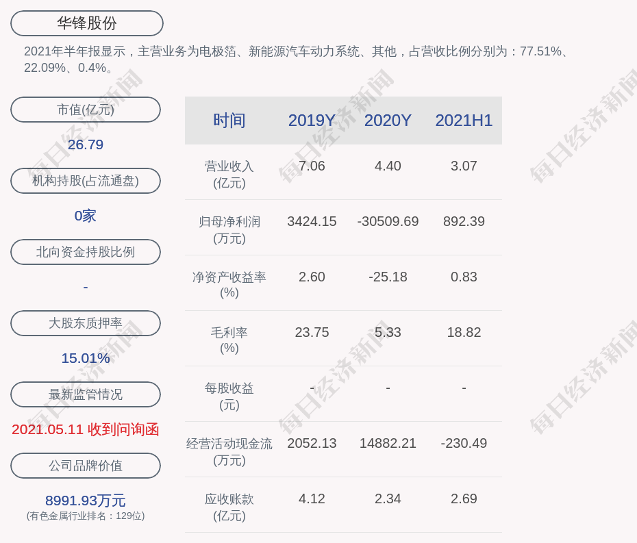 2021年半年报显示,华锋股份的主营业务为电极箔、新能源汽车动力系统、其他,占营收比例分别为:77.51%、22.09%、0.4%。
