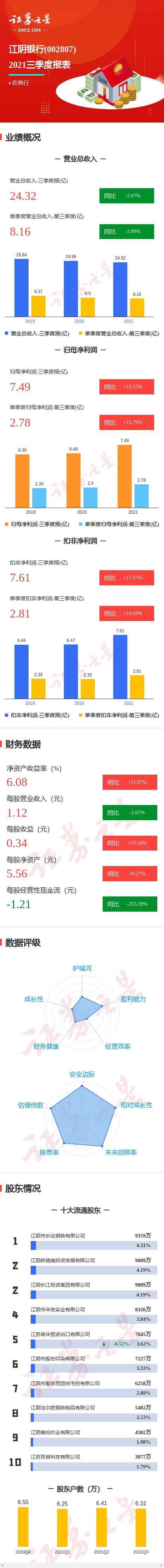 江阴银行2021三季报显示,公司主营收入24.33亿元,同比下降2.67%;归母净利润7.49亿元,同比上升15.55%;扣非净利润7.62亿元,同比上升17.57%;其中2021年第三季度,公司单季度主营收入8.17亿元,同比下降3.99%;单季度归母净利润2.79亿元,同比上升15.79%;单季度扣非净利润2.82亿元,同比上升19.69%;负债率91.34%,投资收益2.57亿元。
