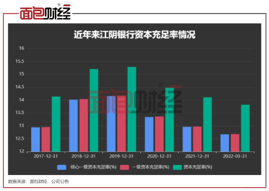 自2020年以来,江阴银行的资本充足率逐年下降。2020年末,资本充足率为14.48%,同比下降0.81个百分点;2021年末,资本充足率为14.11%,同比下降了0.37个百分点。截至2022年一季末,该行的资本充足率为13.82%,较2021年末下降0.29个百分点。