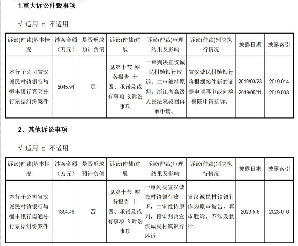 在近日江阴银行发布的2023年半年报中,也提到了有关宣汉诚民村镇银行的诉讼事件。