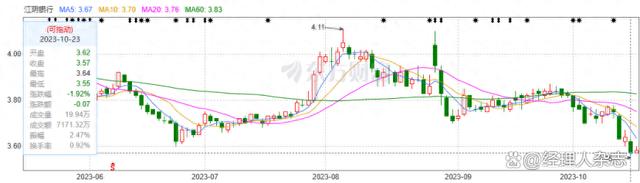 近日江阴银行股价连续下跌,10月23日更是创下历史新低3.55元/股,当天该股收盘报3.57元/股,成交量达到19.94万手,成交额达7171.32万元,这些数据无不显示出二级市场对江阴银行的热情不高,投资者也对江阴银行的股市信心较低。