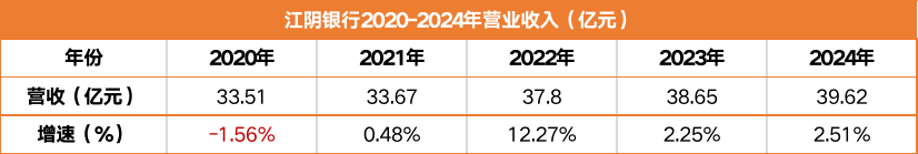 营业收入层面,2024年江阴银行实现营业收入39.62亿元,同比增长2.51%。对比2022年该行12.27%的营收增速,近两年的放缓趋势明显。