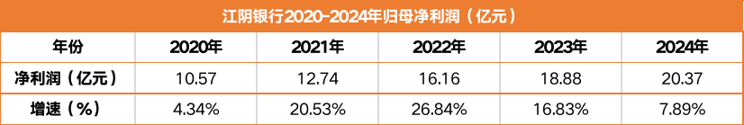 净利润层面,2024年江阴银行实现归母净利润20.37亿元,同比增长7.89%。