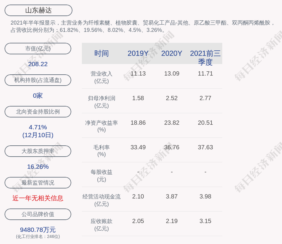 2021年半年报显示,山东赫达的主营业务为纤维素醚、植物胶囊、贸易化工产品-其他、原乙酸三甲酯、双丙酮丙烯酰胺,占营收比例分别为:61.82%、19.56%、8.02%、4.5%、3.26%。