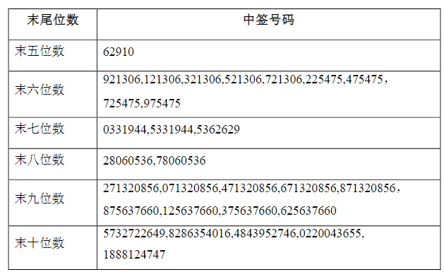 山东赫达7月4日公告,凡参与赫达转债网上申购的投资者持有的申购配号尾数与图片所述号码相同的,则为中签号码。中签号码共有188730个,每个中签号码只能认购10张(1000元)赫达转债。