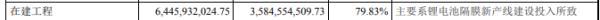 公司三季度报告显示,截至今年第三季度末恩捷股份的存货为27.96亿元,对比2023年初的24.63亿元,增长13.5%。截至今年第三季度末恩捷股份的在建工程64.46亿元,相较2023年初的35.85亿元,增长79.83%,主要系锂电池隔膜新产线建设投入所致。