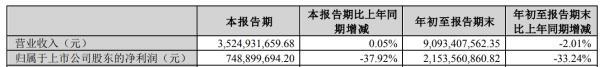 10月31日,恩捷股份发布了2023年度第三季度报告。报告显示,公司在今年第三季度的营业收入为35.25亿元,前三季度营业收入为90.93亿元,同比降低2.01%;公司在上述不同期内的归母净利润分别为7.49亿元和21.54亿元,分别同比降低37.92%、同比降低33.24%。