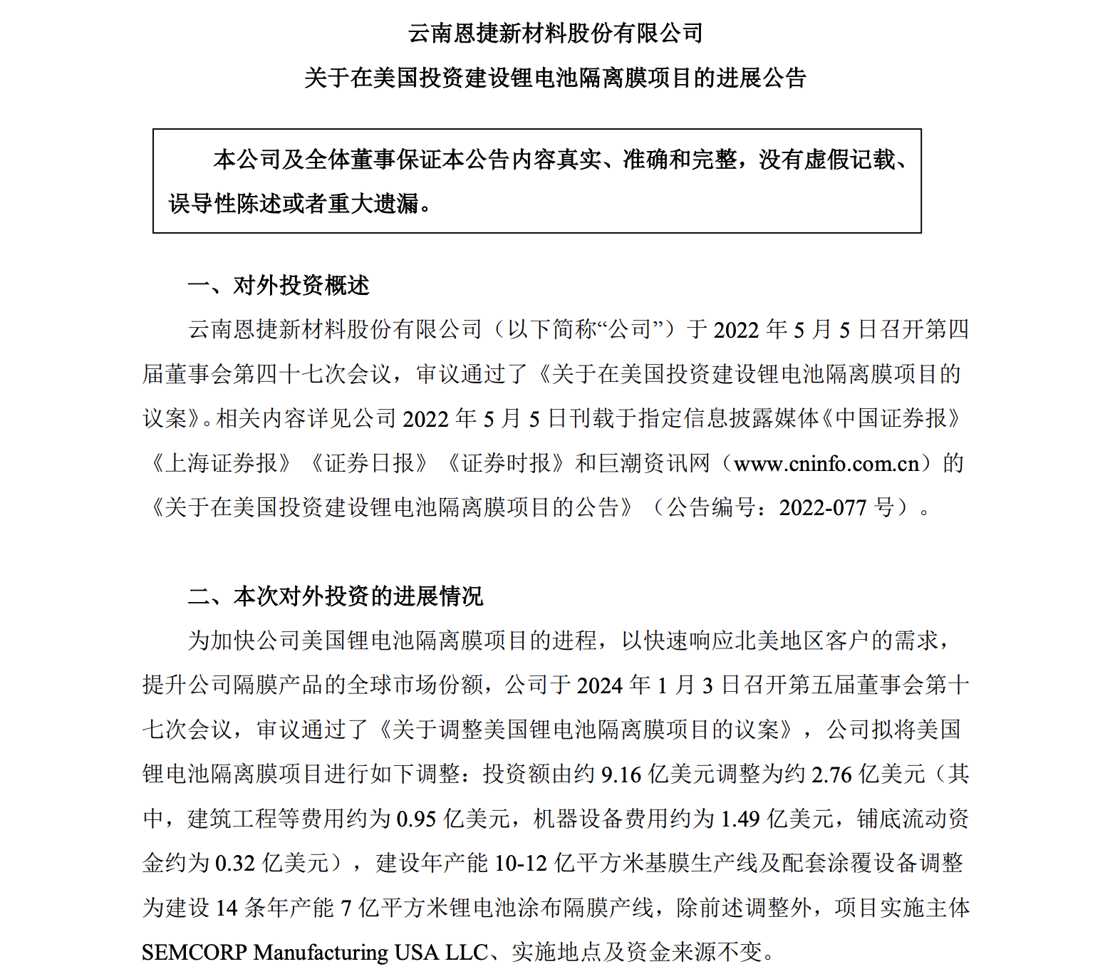 根据公告,恩捷股份拟将美国锂电池隔离膜项目投资额由约9.16亿美元调整为约2.76亿美元(其中,建筑工程等费用约为0.95亿美元,机器设备费用约为1.49亿美元,铺底流动资金约为0.32亿美元)。