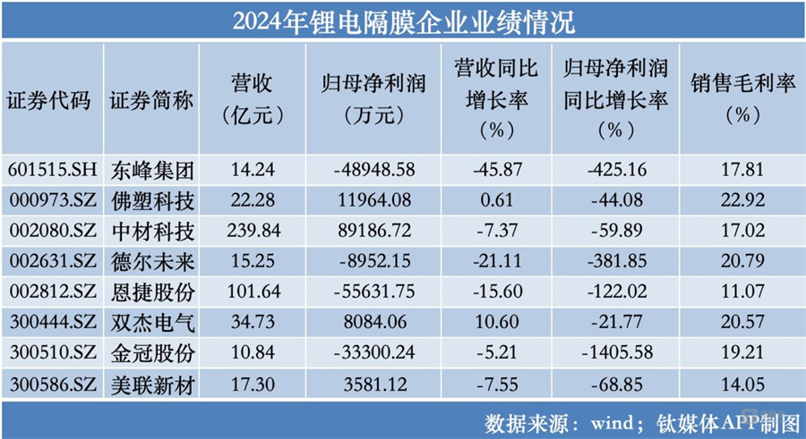 这意味着,白热化的“价格战”下,没有赢家。数据显示,锂电隔膜概念已经有8家公司披露年报,全部盈利下降,东峰集团(SH:601515)、德尔未来(SZ:002631)、金冠股份(SZ:300510)也出现亏损;除双杰电气(SZ:300444)、佛塑科技(SZ:000973)略有增长外,营收也全部下降。
