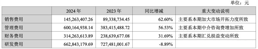 穿透年报,恩捷股份的亏损主因是“三费”大幅增加。2024年,公司销售费用1.45亿元,同比增加62.60%,主要系加大市场开拓力度,更具体在职工薪酬、销售代理费、业务招待费等的增加;管理费用6亿元,同比增加56.53%,主要系中介咨询费、职工薪酬的增加;财务费用3.14亿元,同比增加31.69%,主要为汇兑损益变动。