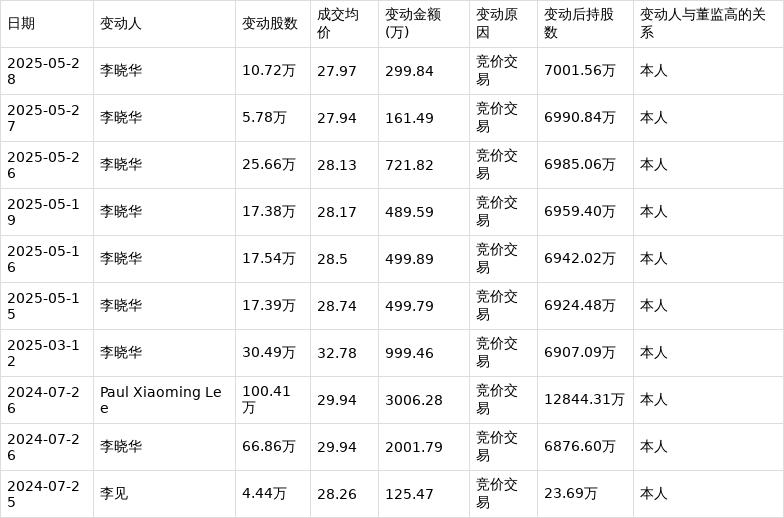 深交所公开信息显示,5月28日,恩捷股份董事、高管李晓华在竞价交易公司股票,增持股数10.72万股,成交均价27.97元,变动金额299.84万元,变动后持股数为7001.56万股。