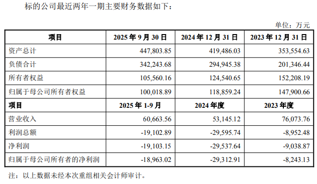 标的公司连亏2年3季,净利润共计-57,679.66万元,归属于母公司所有者的净利润共计-56,519.06万元。2023年度、2024年度、2025年前三季度,标的公司营业收入分别为76,073.76万元、53,145.12万元、60,663.56万元,净利润分别为-9,038.87万元、-29,537.64万元、-19,103.15万元,归属于母公司所有者的净利润分别为-8,243.13万元、-29,312.91万元、-18,963.02万元。