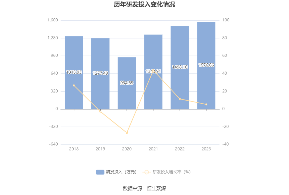 2023年全年,公司研发投入金额为1576.66万元,同比增长5.24%;研发投入占营业收入比例为3.41%,相比上年同期下降0.09个百分点。此外,公司全年研发投入资本化率为0。