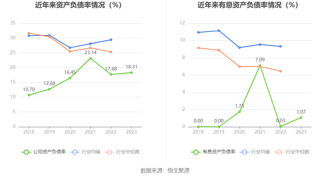 在偿债能力方面,公司2023年年末资产负债率为18.31%,相比上年末上升0.63个百分点;有息资产负债率为1.07%,相比上年末上升1.04个百分点。