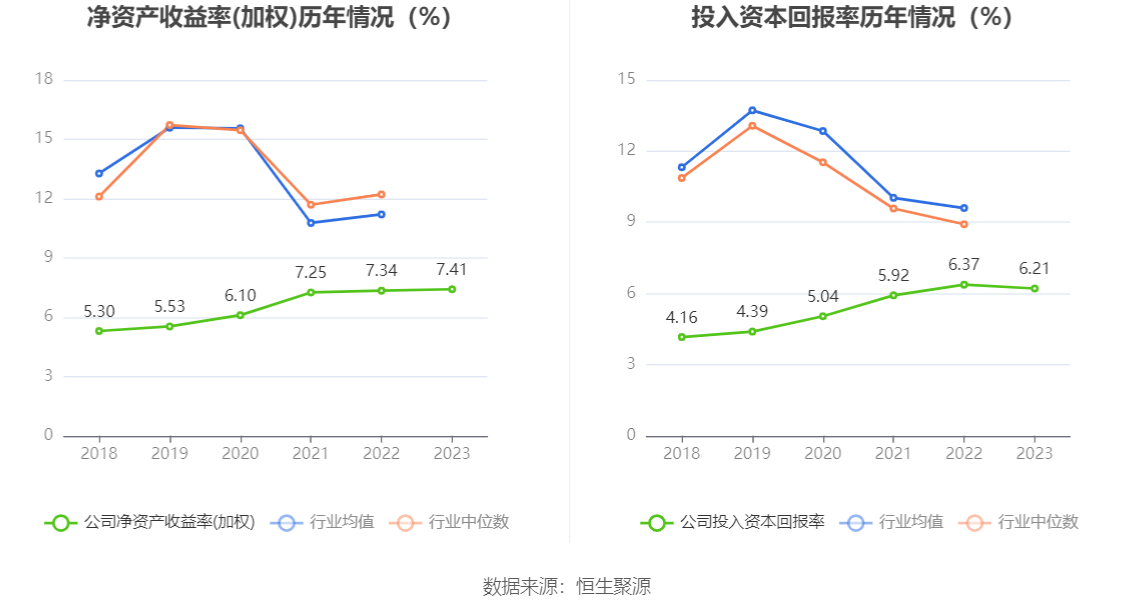 数据显示,2023年公司加权平均净资产收益率为7.41%,较上年同期增长0.07个百分点;公司2023年投入资本回报率为6.21%,较上年同期下降0.16个百分点。