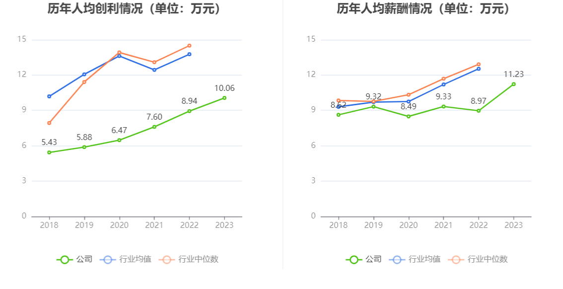 截至2023年末,公司员工总数为645人,人均创收71.75万元,人均创利10.06万元,人均薪酬11.23万元,较上年同期分别增长14.07%、12.54%、25.09%。