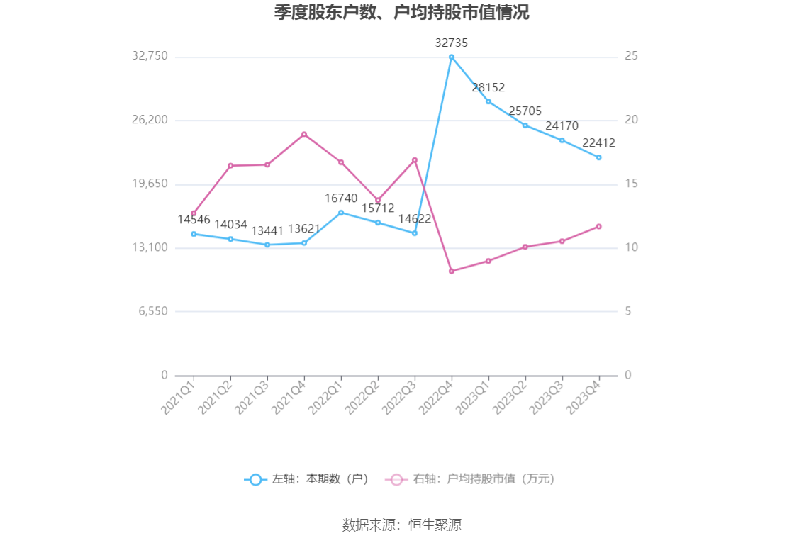 筹码集中度方面,截至2023年年末,公司股东总户数为2.24万户,较三季度末下降了1758户,降幅7.27%;户均持股市值由三季度末的10.54万元上升至11.69万元,增幅为10.91%。