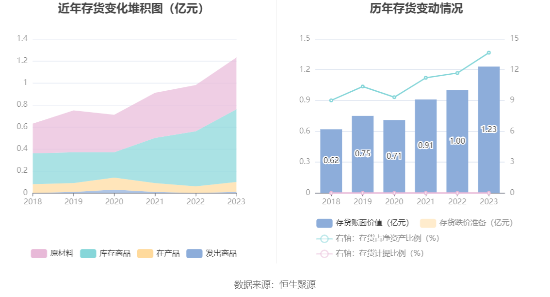 从存货变动来看,截至2023年年末,公司存货账面价值为1.23亿元,占净资产的13.65%。根据财报,公司本期没有计提存货跌价准备。