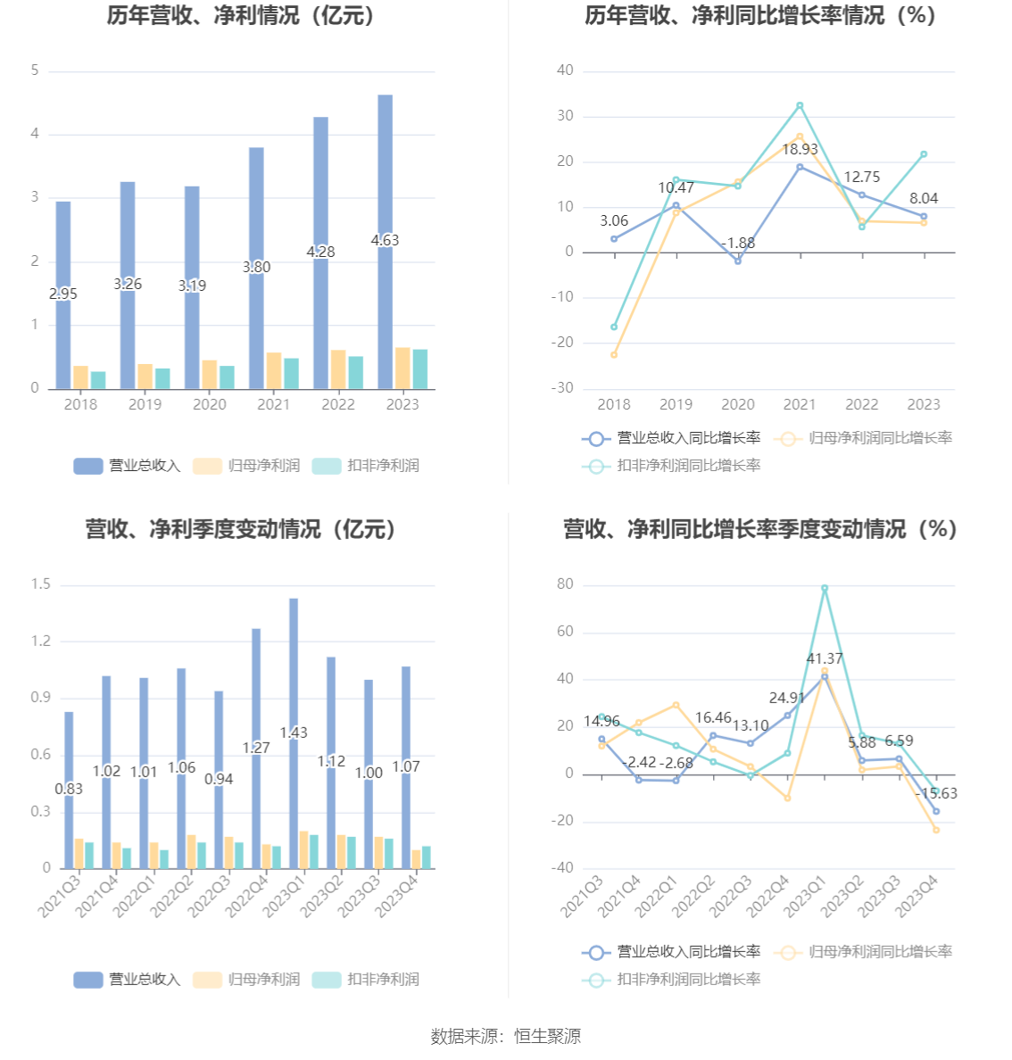 2023年,公司毛利率为29.36%,同比上升2.04个百分点;净利率为14.07%,较上年同期下降0.17个百分点。从单季度指标来看,2023年第四季度公司毛利率为28.89%,同比上升4.01个百分点,环比上升0.56个百分点;净利率为9.16%,较上年同期下降0.87个百分点,较上一季度下降7.94个百分点。