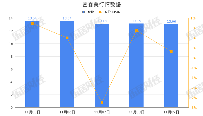 截至11月09日,富森美(002818.SZ)股价收盘报13.15元,跌0.68%,总市值97.75亿元。