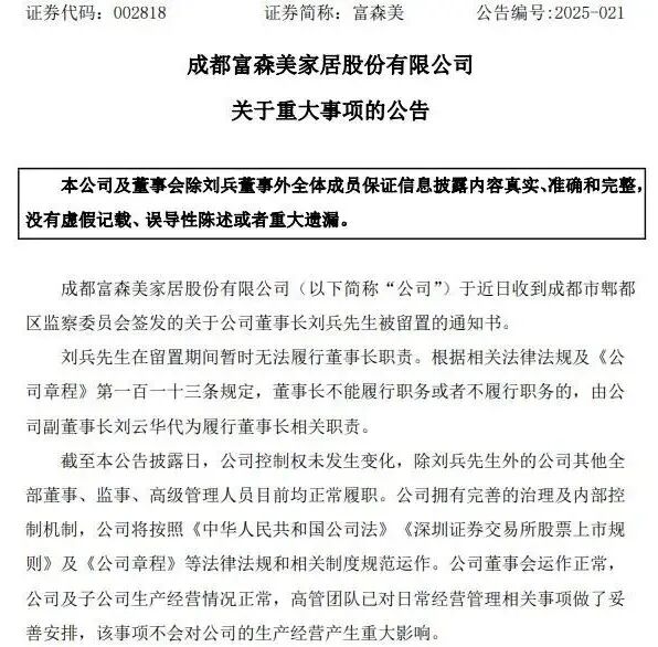 2025年7月25日,富森美发布公告称,公司收到成都市郫都区监察委员会签发的关于公司董事长刘兵被留置的通知书。