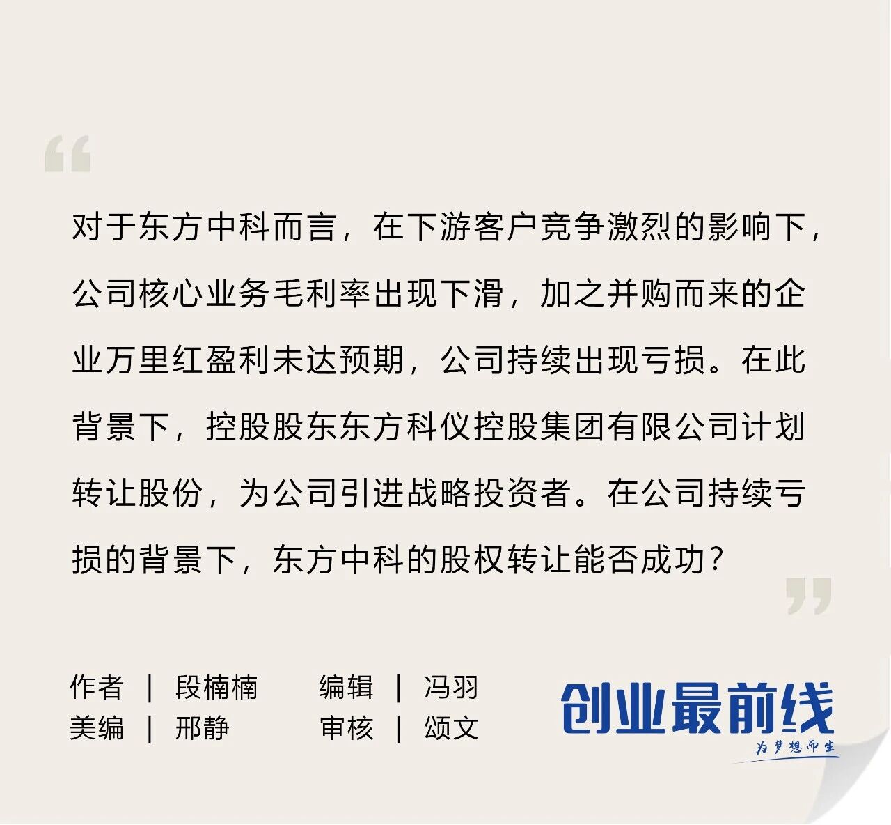 对于东方中科而言,在下游客户竞争激烈的影响下,公司核心业务毛利率出现下滑,加之并购而来的企业万里红盈利未达预期,公司持续出现亏损。在此背景下,控股股东东方科仪控股集团有限公司计划转让股份,为公司引进战略投资者。在公司持续亏损的背景下,东方中科的股权转让能否成功,「创业最前线」将持续保持关注。