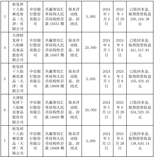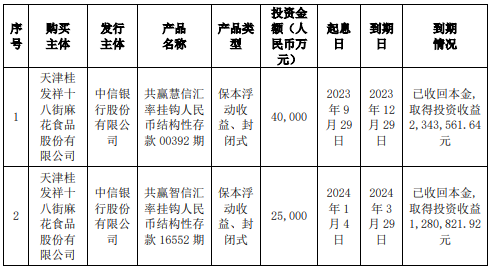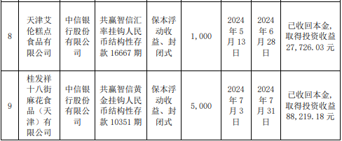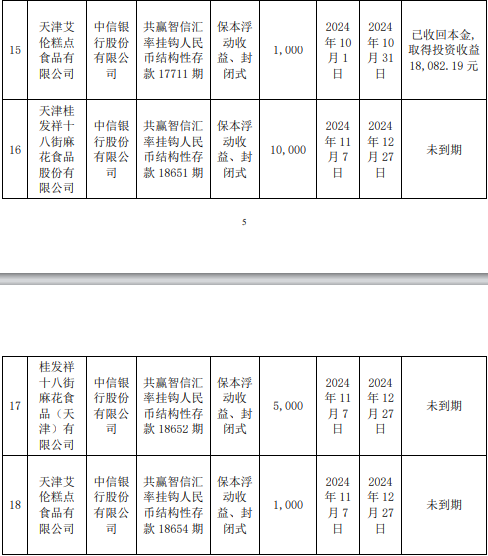 11月7日,桂发祥披露关于购买理财产品的进展公告。根据上述决议,公司及全资子公司桂发祥十八街麻花食品(天津)有限公司、天津艾伦糕点食品有限公司近期使用暂时闲置自有资金共计人民币16,000万元购买结构性存款产品,并与中信银行股份有限公司天津分行签订了协议。本次购买的理财产品为短期低风险的保本浮动收益型结构性存款,期限为50天。