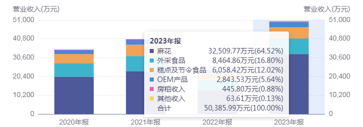 二是业务高度集中于单一产品。桂发祥的产品包括麻花产品、糕点及方便食品、其中麻花产品贡献了大部分营收。据2023年年报,麻花产品营收为3.25亿元,占比达64.53%。