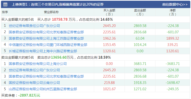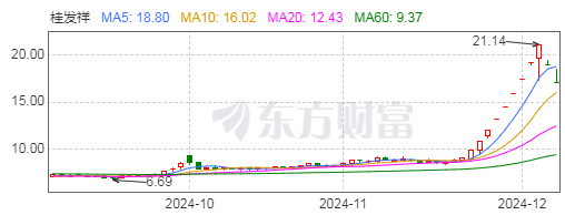 12月3日,桂发祥登上龙虎榜,当日报收19.22元,涨幅10.02%,成交量3313.35万股。其中,知名游资国泰君安上海江苏路营业部现身,该席位狂买近2000万,算是深度参与其中。