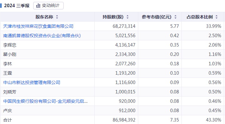 从桂发祥的前十大股东来看,公司股权结构很分散,第一大股东天津市桂发祥麻花饮食集团有限公司从持股比例为33.99%,第二名开始持股比例仅有2.5%,第十大股东持股比例更是仅有0.45%。