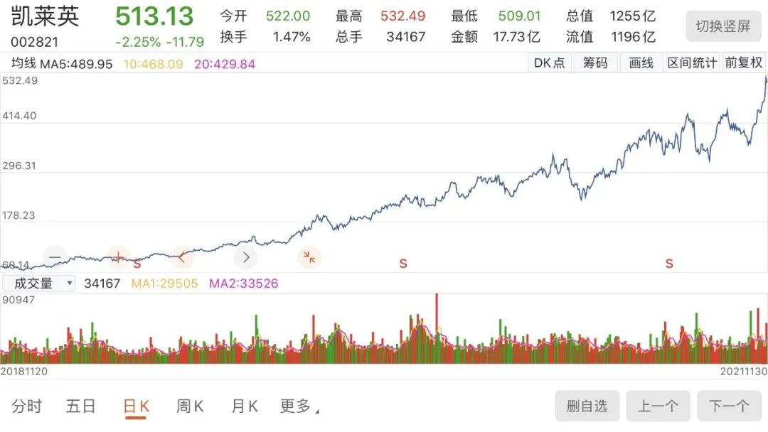 而回顾今年的凯莱英可谓是“一波三折”。从股价上来看,自2020年3月至8月上旬,凯莱英股价累计涨幅超100%,总市值一举突破千亿大关。