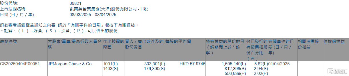 格隆汇4月8日丨根据联交所最新权益披露资料显示,2025年4月1日,凯莱英(06821.HK)获JPMorgan Chase & Co.以每股均价57.9746港元增持好仓30.33万股,涉资约1758.38万港元。