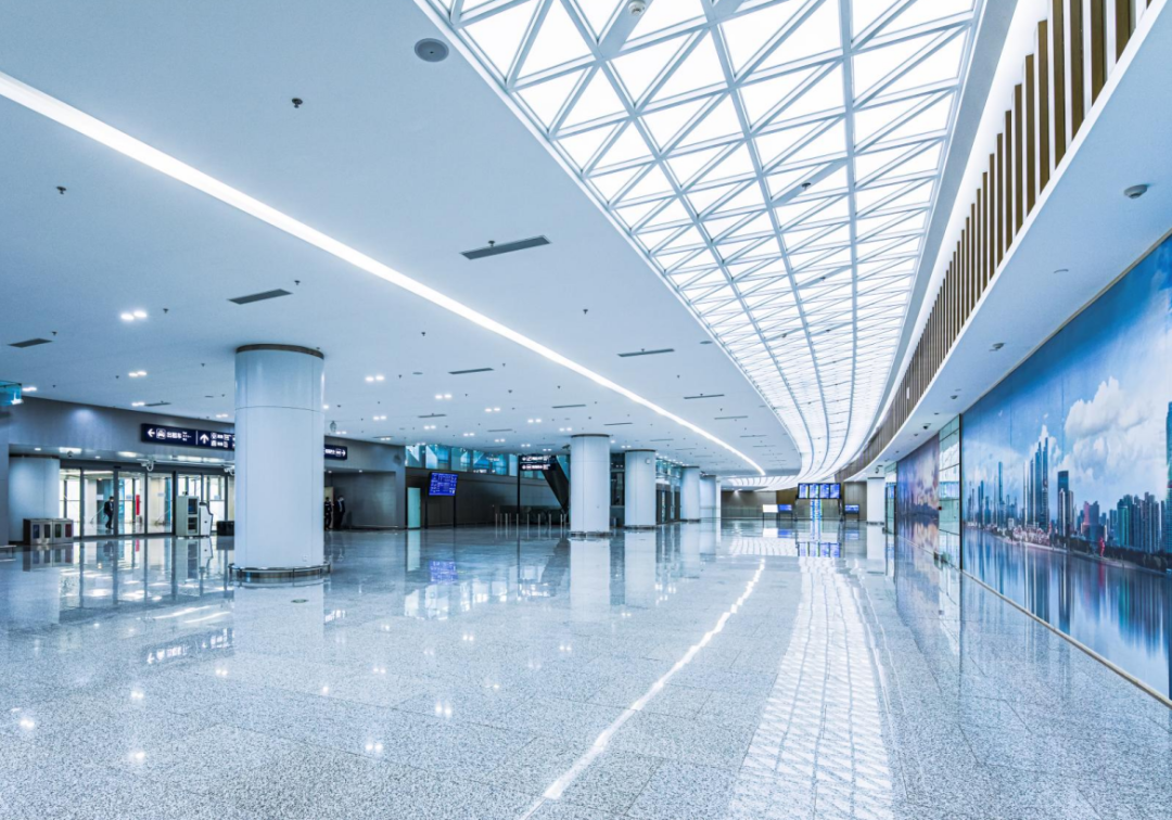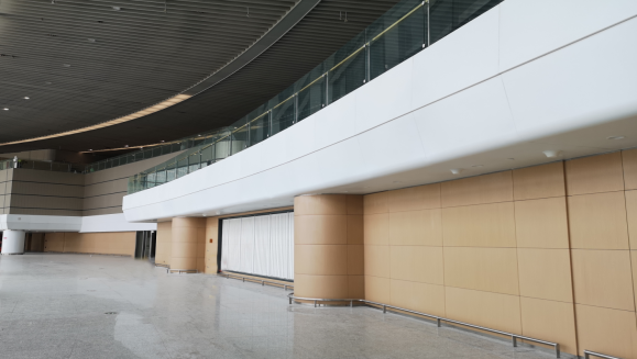 青岛胶东国机场迎宾大厅东西跨度260米、南北宽度35米,天花完成高度在10.05米,其吊顶面积约7000㎡,其中最为突出的天花吊顶设计采用了近4800个铝方通亚克力发光三角造型,从西向东260米长一气呵成、连片组成了面积约1500㎡气势恢宏的大型发光造型吊顶的精装修方案,其中发光造型吊顶北侧一边紧靠大厅弧形墙,顺延着弧形墙面向东西两侧延伸,而发光造型吊顶南侧一边与石膏板天花吊顶连接,也顺东西方向呈现不规则大弧造型。