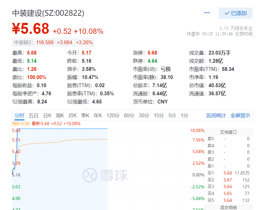 5月25日,截至午间收盘,中装建设(002822.SZ)股价涨10.08%,报5.68元,总市值为40.53亿元。