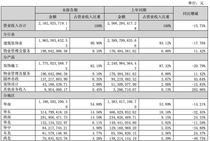 公告显示,报告期内,中装建设实现营业收入21.62亿元,同比减少15.75%,其中,装饰施工收入下滑20.79%,装饰设计收入下滑15.83%。中装建设称,营业收入下滑主要系受疫情影响,疫区的项目进度放缓所致。