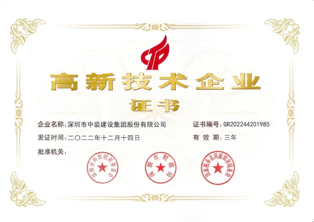 近期,中装建设子公司深圳市中装智链科技有限公司(以下简称“中装智链科技”)喜获“国家高新技术企业”证书,标志着集团再添一家国家高新技术企业。同时,中装建设通过深圳市2022年度“高新技术企业”复核。自此,中装建设大家庭已有三家国家高新技术企业,包括中装建设及子公司中装市政园林、中装智链科技。