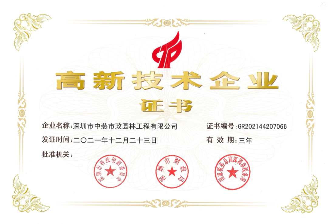 ▲中装市政园林高新技术企业证书