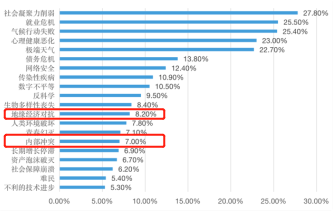 2022年1月11日,在世界经济论坛年会召开前夕,世界经济论坛曾发布《2022年全球风险报告》,报告中将地缘列为全球面临的主要风险之一。在全球风险感知调查(GRPS)对全球近千名学界、商界、政界和社会人士的采访中,仅对地缘经济对抗、内部冲突这两项选择就超过了15%的投票率。