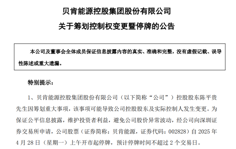 贝肯能源25日晚发布公告称,公司控股股东陈平贵因筹划重大事项,该事项可能导致公司控股股东及实际控制人发生变更。经向深交所申请,公司股票自4月28日(星期一)上午开市起停牌,预计停牌时间不超过2个交易日。