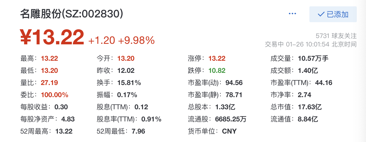 1月26日,截至上午10:01,名雕股份报13.22元,涨9.98%,总市值约17.63亿元。