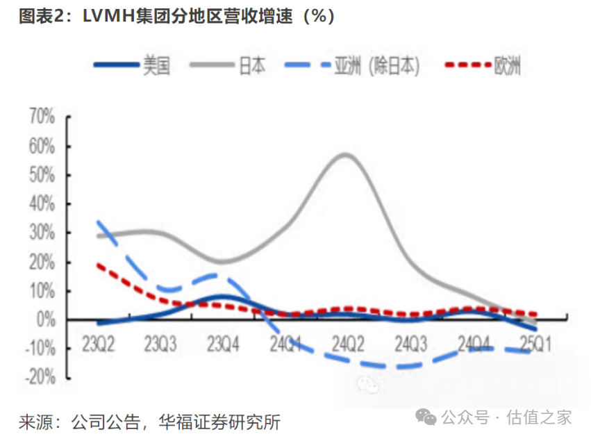 首先是原本正向的行业beta转为负beta。根据LVMH财报,LVMH在亚洲(除日本)地区的营业收入增速,从2024Q1以来已经连续五个季度为负,由于一线奢侈品的客群是抗经济周期风险最强的一批人,因此一线奢侈品的业绩压力往往传导速度最慢,现在一线奢侈品牌的业绩连续下滑已是客观事实,作为定位中高端(对标三四线奢侈品)的比音勒芬,从逻辑上讲只可能承担更大业绩压力。