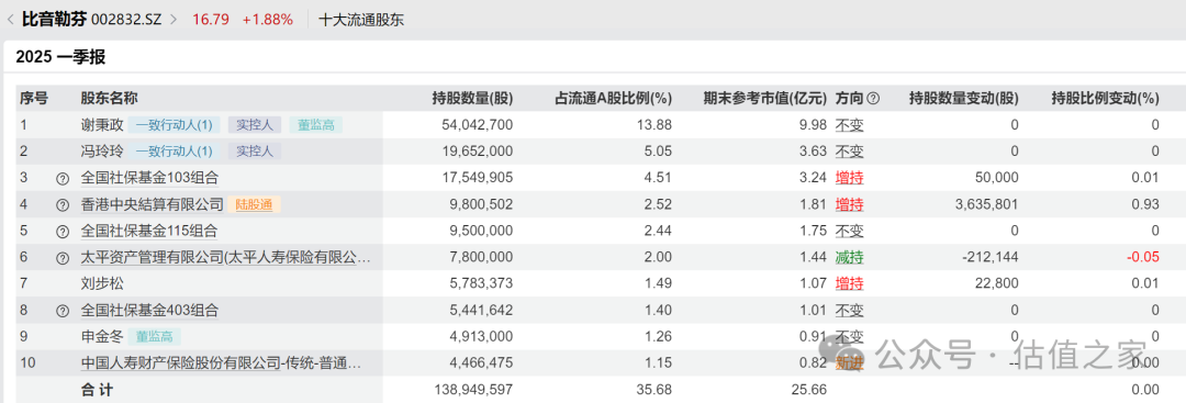 截止到2025Q1,机构持股占流通股比例下降到18.2%,尽管被戴维斯双杀,但比音勒芬仍被社保基金重仓持有,而且还被逆势加仓,社保总持股占流通股比例高达8.4%,用价值投资者的“真爱”来描述,怕是也不为过。