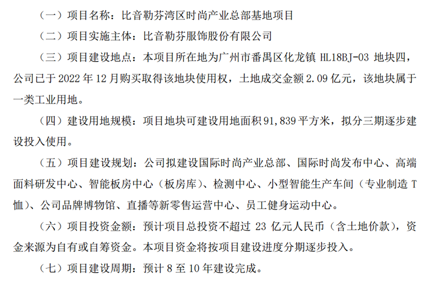 更令人疑惑的是,向来以轻资产模式运营的比音勒芬,在2024年6月宣布斥资不超过23亿元(含土地价款)建设湾区时尚产业总部基地项目。该项目规划建设国际时尚产业总部、国际时尚发布中心等多个项目,预计8-10年建设完成。