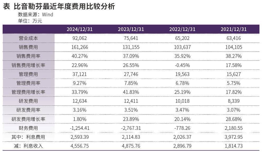 比对公司2024年年报和2023年报,可以发现,公司净利润的下滑,主要是销售费用和管理费用的上升。比音勒芬2024年的销售费用比2023年高出3.01亿元,管理费用高出9357万元,两者相加为3.95亿元,而2024年的净利润比2023年低了1.30亿元。如果比音勒芬的销售费用率和管理费用率在这两年保持一致,那么,2024年公司的净利润同比将略有增长。