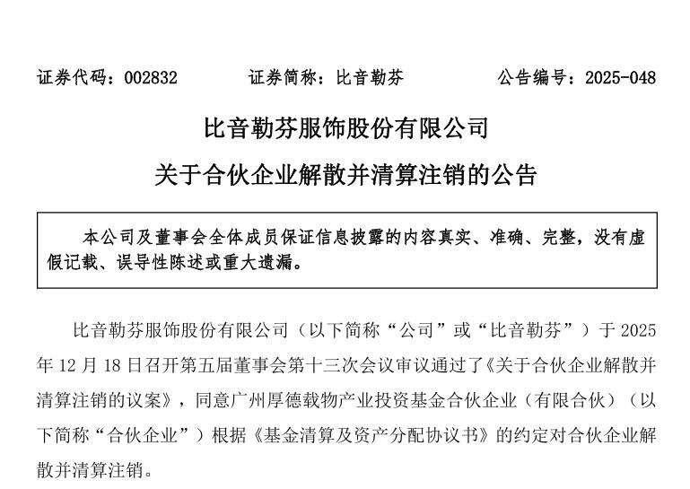 比音勒芬在公告中表示,鉴于合伙企业投资目的已实现,依据经营发展需要,为优化管理成本,提升运营效率,经合伙企业全体合伙人友好协商,一致同意提前解散合伙企业并启动清算。