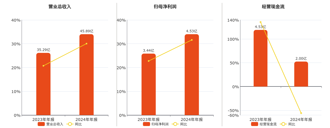 公司营业总收入为45.89亿元。归母净利润为4.53亿元。经营活动现金净流入为2.00亿元,较去年同报告期经营活动现金净流入减少2.53亿元,同比较去年同期下降55.89%。