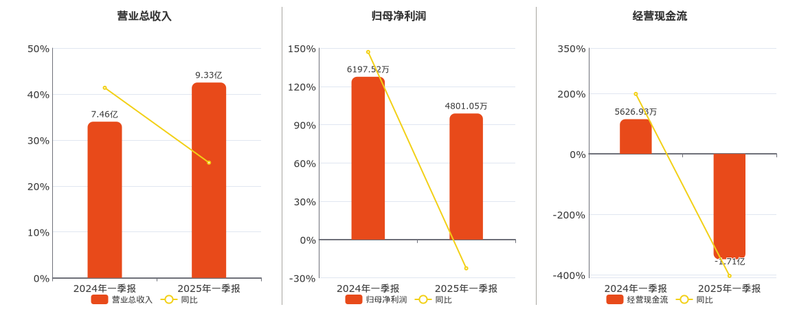 公司营业总收入为9.33亿元。归母净利润为4801.05万元,较去年同报告期归母净利润减少1396.47万元,同比较去年同期下降22.53%。经营活动现金净流入为-1.71亿元,较去年同报告期经营活动现金净流入减少2.27亿元,同比较去年同期下降403.49%。