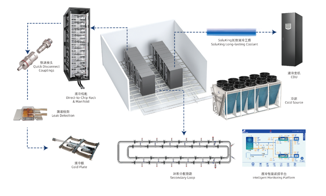 其中,核心突破在于英维克Coolinside全链条液冷方案。从热端的GPU/CPU芯片的冷板、冷量传输中的管路、快速接头、Manifold、CDU、SoluKing数据中心长效液冷工质,再到一次侧的冷源等,英维克通过自主研发、自主生产、自主交付、自主服务,真正做到从热到冷的“全链条”解决方案,让液冷系统运行更可靠,确保液冷系统“四维一体,风险归零”。