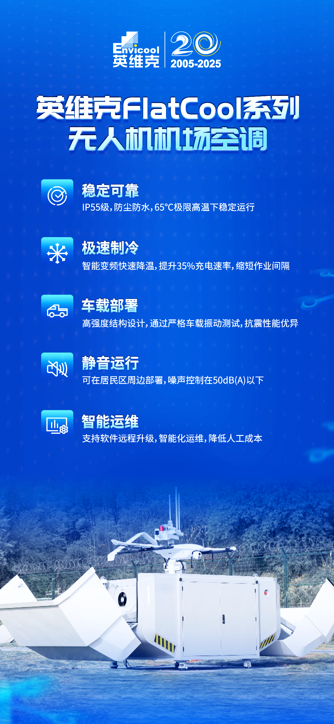 英维克FlatCool低空温控解决方案,凭借卓越的环境适应性与高效的智能温控能力,已成为无人机机场在电力巡检、城市治理、物流配送等户外复杂场景下稳定运行的关键保障。